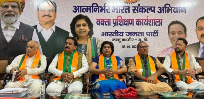 The workshop was addressed by BJP National Secretary & Atmanirbhar Bharat Programme J&K Prabhari Dr. Alka Gurjar and BJP J&K General Secretary (Organization) Ashok Koul, while it was chaired by J&K BJP Vice-President Rajeev Charak. Former Deputy Chief Minister Dr. Nirmal Singh, General Secretaries Sanjita Dogra (Convenor of Abhiyan for J&K) and Gopal Mahajan, Secretaries Dinesh Sharma and Pawan Sharma, and CA Rajiv Gupta also addressed the workshop.