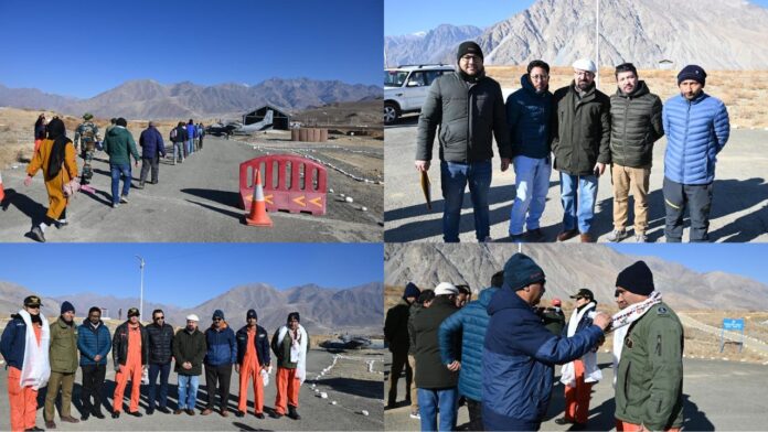 Chairman/CEC, LAHDC, Kargil, Dr Mohd Jaffer Akhoon, Secretary Civil Aviation, UT Ladakh, Ravinder Dangi, Deputy Commissioner/CEO, LAHDC, Kargil, Shrikant Suse today welcomed the Indian Air Force Pilots and crews for the commencement of the AN-32 Courier Service to Kargil.