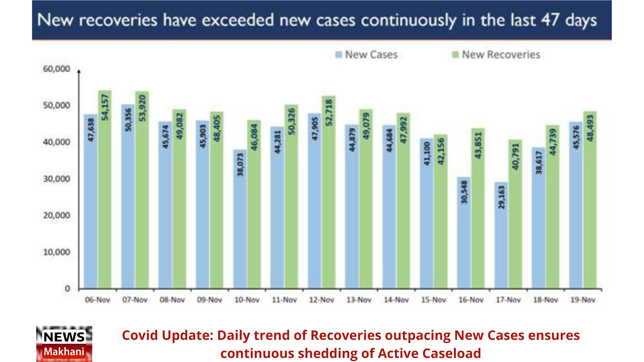The new recoveries continue to overtake the daily new cases continuously since the past 47 days.