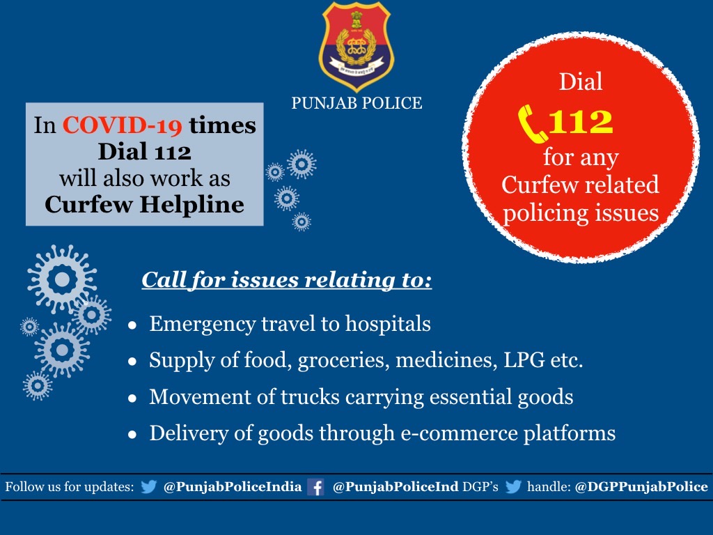 Disclosing this here today, a spokesman of Punjab police said that any person from across the state could dial 112 for seeking facilities like emergency travel to hospitals, supply of food, groceries, medicines, LPG besides ensuring hassle free movement of trucks carrying essential goods and delivery of goods through e-commerce platforms.