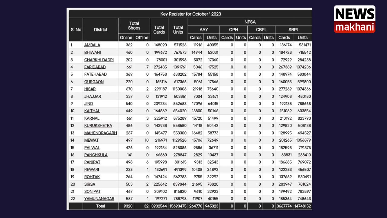 हरियाणा सरकार के पीपीपी कोऑर्डिनेटर डॉ. सतीश खोला ने बताया कि अक्टूबर महीने में पूरे प्रदेश में 263451 नए बीपीएल कार्ड बने हैं जिसमें अंबाला में 9755 , भिवानी में 11412, चरखी दादरी में 4362,फरीदाबाद में 50321 फतेहाबाद में 8528, गुरुग्राम में 22643, हिसार में 17056, झज्जर में 11444, जींद में 11373, कैथल में 8142, करनाल में 10899, कुरुक्षेत्र में 8113, महेंद्रगढ़ में 8210, मेवात में 7026, पलवल में 8334, पंचकूला में 6062, पानीपत में 9546, रेवाड़ी में 8677, रोहतक में 8899, सिरसा में 9648, सोनीपत में 12305, यमुनानगर में 10146 सहित कुल 263451 कार्ड कार्ड बनें हैं।