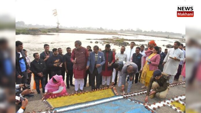 मण्डला के रपटाघाट में श्री राम मंदिर की आकृति पर 11 हजार दीप प्रज्वलित किए