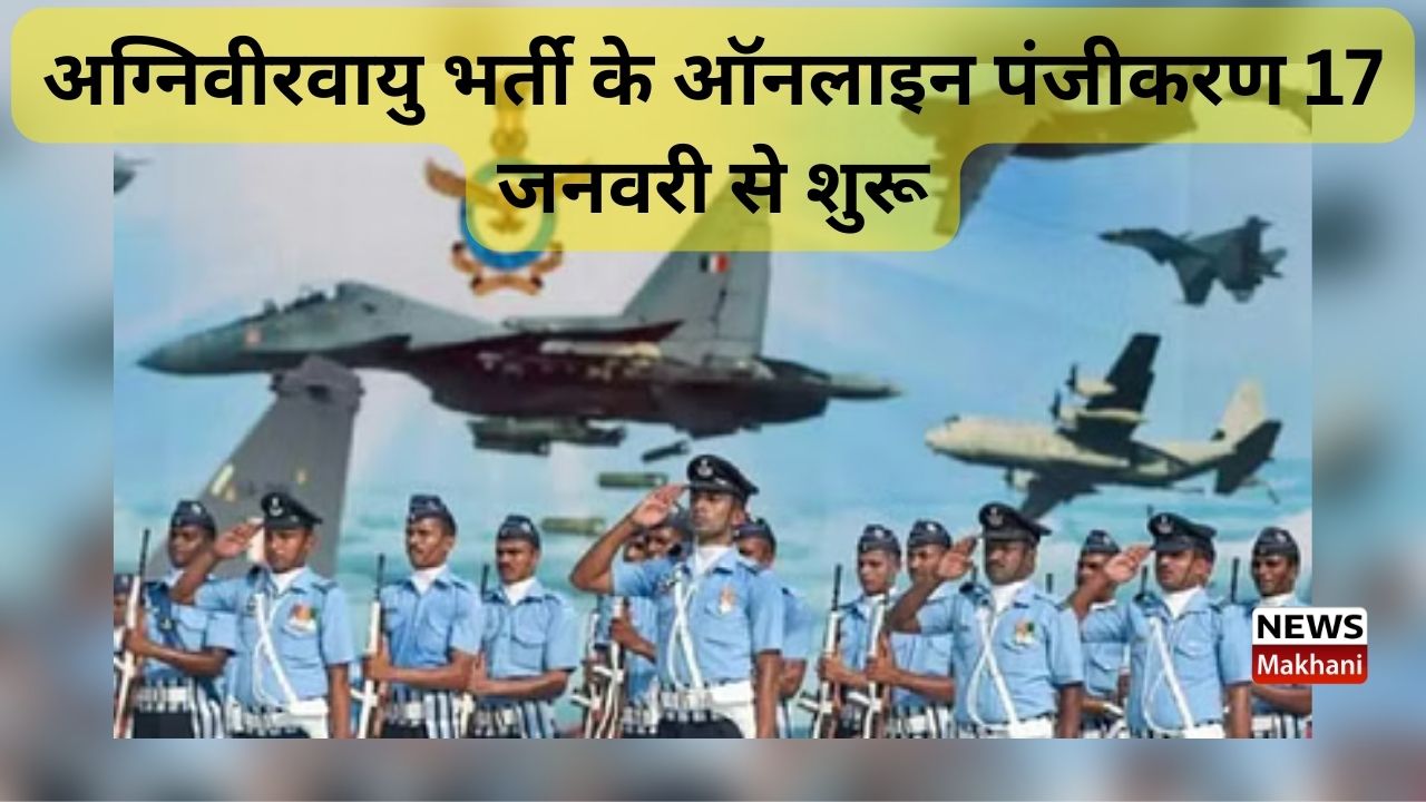 भारतीय वायुसेना मे अग्निपथ स्कीम के अन्तर्गत अग्निवीरवायु भर्ती लिए ऑनलाइन पंजीकरण 17 जनवरी से आरंभ होगा। इच्छुक अविवाहित पुरुष एवं महिला उम्मीदवार भर्ती से संबंधित नियमों की विस्तृत जानकारी भारतीय वायुसेना की आधिकारिक वेबसाईट www.agnipathvayu.cdac.in से प्राप्त कर सकते हैं। अभ्यर्थी अग्निवीर वायु की भर्ती के लिए 17 जनवरी 2024 सुबह 11 बजे से 6 फरवरी 2024 रात 11 बजे तक www.agnipathvayu.cdac.in  पर लॉग इन कर ऑनलाईन पंजीकरण कर सकते हैं।