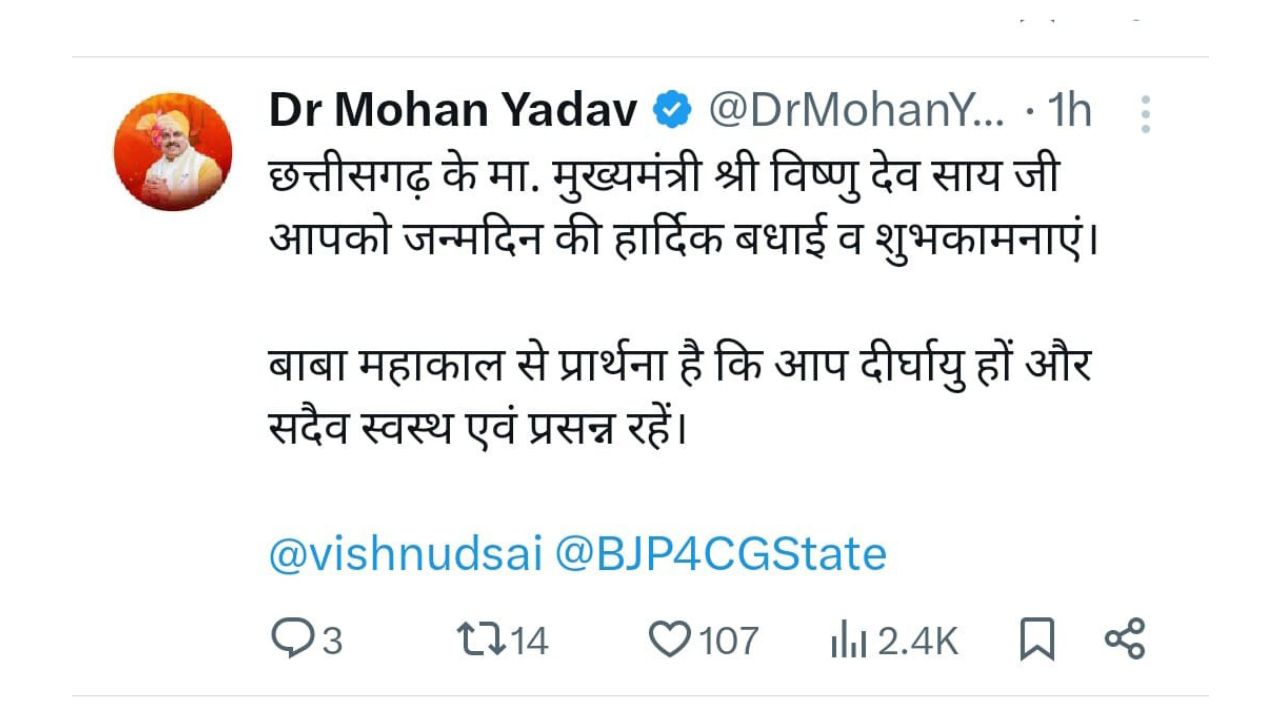 छत्तीसगढ़ मध्यप्रदेश के मुख्यमंत्री डॉ मोहन यादव ने मुख्यमंत्री श्री विष्णु देव साय को जन्मदिन की बधाई दी 22/02/2024 FacebookTwitterPinterestWhatsApp रायपुर, 21 फरवरी, 2024 मध्यप्रदेश के मुख्यमंत्री डॉ मोहन यादव ने मुख्यमंत्री श्री विष्णु देव साय को जन्मदिन की बधाई दी l