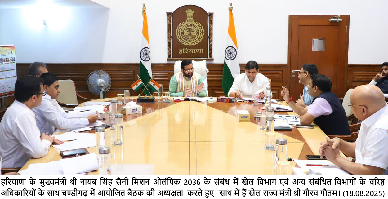 मुख्यमंत्री आज हरियाणा सिविल सचिवालय में मिशन ओलंपिक 2036 के संबंध में खेल विभाग एवं अन्य संबंधित विभागों के वरिष्ठ अधिकारियों के साथ उच्चस्तरीय बैठक की अध्यक्षता कर रहे थे। बैठक में उन्होंने राज्य में खेल प्रतिभाओं को अंतरराष्ट्रीय स्तर पर तैयार करने, खेल अवसंरचना को सुदृढ़ बनाने और खिलाड़ियों को विश्वस्तरीय सुविधाएं उपलब्ध कराने के लिए ठोस रणनीति तैयार करने पर जोर दिया।