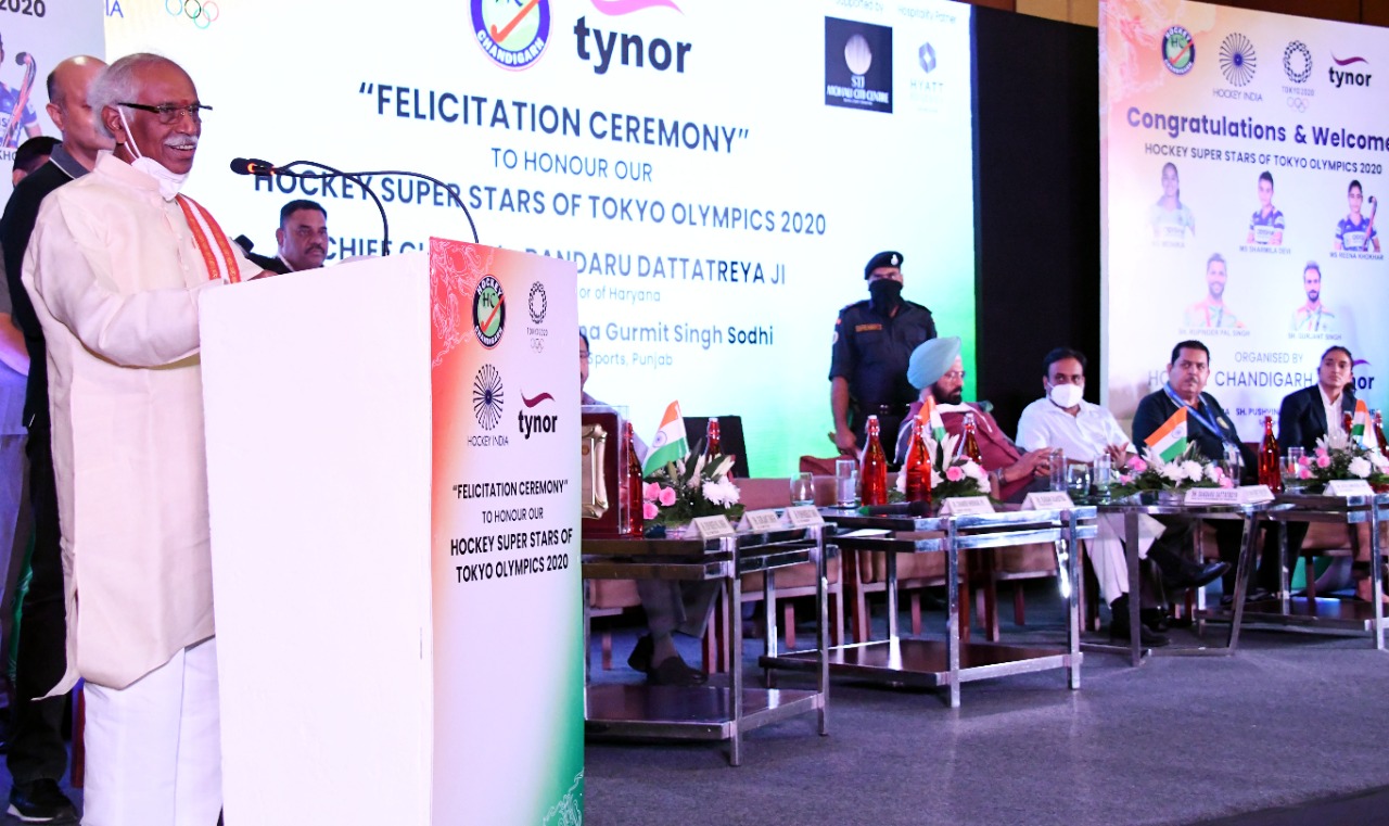 चंडीगढ़, 21 अगस्त,2021 हरियाणा के राज्यपाल श्री बंडारु दत्तात्रेय ने हॉकी चंडीगढ़ द्वारा शनिवार को स्थानीय हयात रीजेंसी में आयोजित एक सम्मान समारोह में टोक्यो ओलंपिक के चंडीगढ़ से सम्बंधित हॉकी खिलाड़ियो को सम्मानित किया ।इस सम्मान समारोह पंजाब के खेल मंत्री राणा गुरमीत सिंह सोढ़ी विशिष्ट अतिथि थे।
