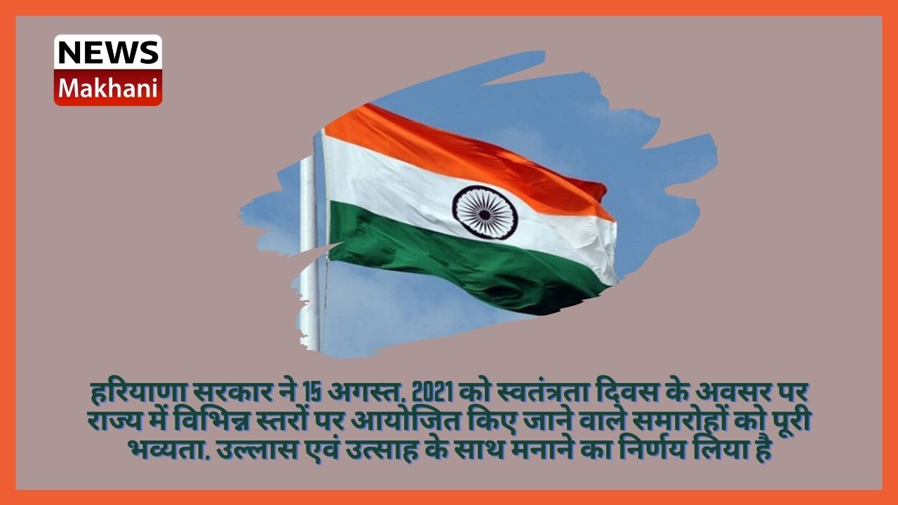 हरियाणा सरकार ने 15 अगस्त, 2021 को स्वतंत्रता दिवस के अवसर पर राज्य में विभिन्न स्तरों पर आयोजित किए जाने वाले समारोहों को पूरी भव्यता, उल्लास एवं उत्साह के साथ मनाने का निर्णय लिया है