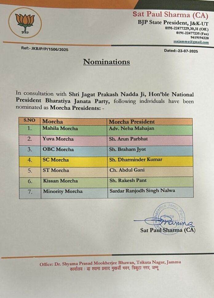 In consultation with Sh. Jagat Prakash Nadda ji, Hon’ble National President, Bharatiya Janata Party, Sh. Sat Sharma, President, Bharatiya Janata Party Jammu & Kashmir, has announced the BJP Morcha Presidents for the Union Territory of Jammu & Kashmir.