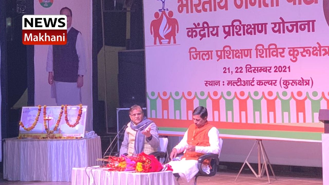 भाजपा प्रदेशाध्यक्ष ओम प्रकाश धनखड मंगलवार को मल्टी आर्ट कलचर सेंटर के सभागार में भाजपा कार्यकर्ताओं के दो दिवसीय प्रशिक्षण शिविर के तीसरे सत्र में बोल रहे थे। इससे पहले प्रदेशाध्यक्ष ओम प्रकाश धनखड, प्रदेश संगठन महामंत्री रविन्द्र राजू, भाजपा के जिला अध्यक्ष राजकुमार सैनी, प्रदेश मीडिया प्रभारी डा. संजय शर्मा, बुद्घि जीवी प्रकोष्ठï के प्रदेश संयोजक भारत भूषण भारती ने भारत माता, डाक्टर श्यामा प्रसाद मुखर्जी व पंडित दीन दयाल उपाध्याय के  चित्रों पर पुष्प अर्पित कर और दीप प्रज्ज्वलित कर कार्यक्रम का शुभारंभ किया। इस सम्मेलन में 6 सत्रों का आयेाजन किया गया। इन सत्रों की अध्यक्षता भाजपा के जिला अध्यक्ष राजकुमार सैनी ने की।