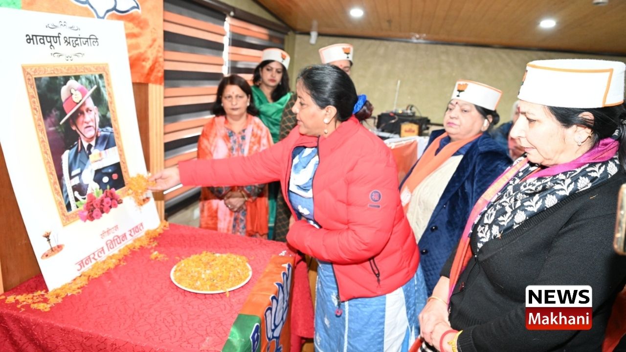 सीडीएस जनरल बिपिन रावत का हेलीकाप्टर हादसे में निधन होने से हर वर्ग के लोग शोक में डूबे हुए हैं। जनरल बिपिन रावत को महिला मोर्चा द्वारा भावपूर्ण श्रद्धांजलि अर्पित की गई। कार्यसमिति को संबोधित करते हुए इंदु गोस्वामी ने कहा असम , दिल्ली और चंडीगढ़ में संगठन का काम कर शिमला आयी हूं।