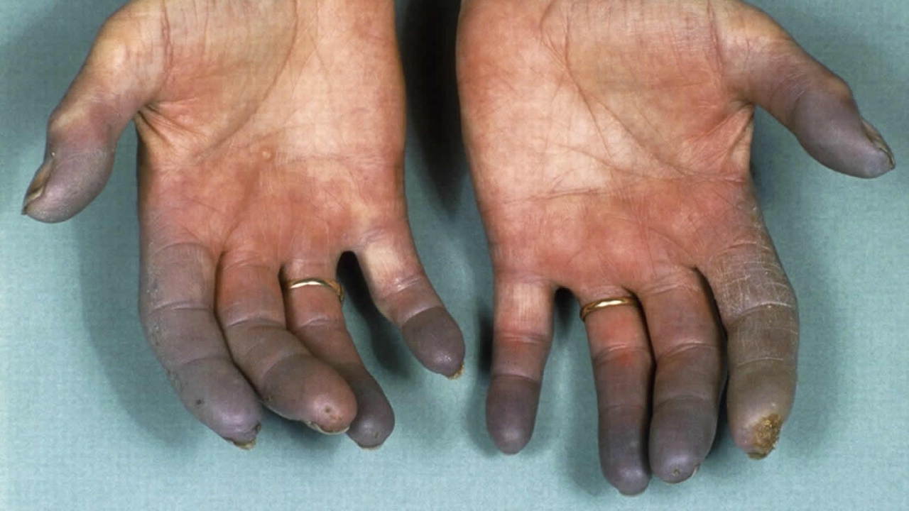 Clots in the blood, ulcers on the fingers and toes, a change in the color of the skin on the fingers and toes to pale, reddish, and occasionally bluish skin, and soreness or pain in the hands or forearms.