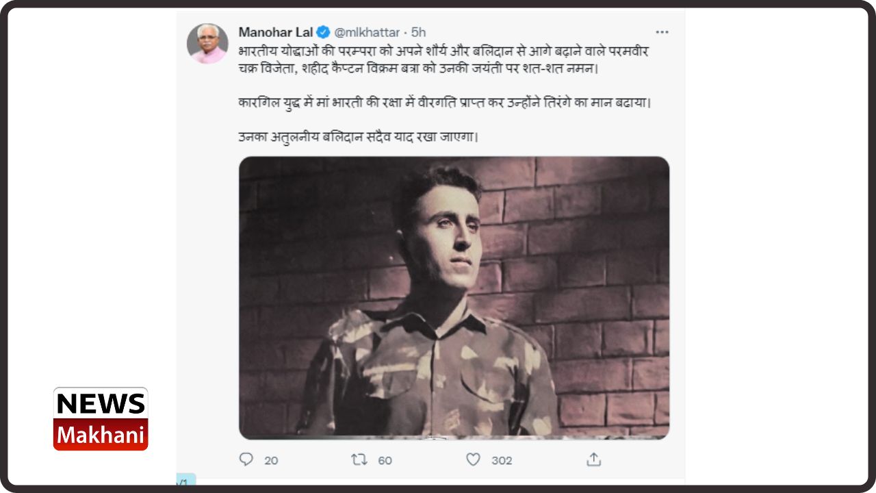 चंडीगढ़, 9 सितंबर – हरियाणा के मुख्यमंत्री श्री मनोहर लाल ने परमवीर चक्र विजेता शहीद कैप्टन विक्रम बत्रा को उनकी जयंती पर नमन किया।