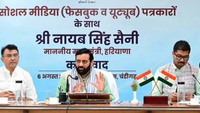 हरियाणा के मुख्यमंत्री श्री नायब सिंह सैनी ने आज हरियाणा निवास, चंडीगढ़ में प्रदेशभर से आए सोशल मीडिया प्लेटफॉर्म्स (फेसबुक व यूट्यूब) के न्यूज चैनलों के प्रतिनिधियों के साथ जनसंवाद किया। इस अवसर पर डिजिटल मीडिया जर्नलिस्ट एसोसिएशन, हरियाणा के प्रतिनिधियों ने मुख्यमंत्री का पुष्प गुच्छ भेंट कर अभिनंदन किया।