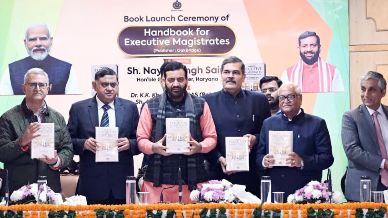 हरियाणा के मुख्यमंत्री श्री नायब सिंह सैनी ने मंगलवार को ‘हैंडबुक फॉर एग्जीक्यूटिव मजिस्ट्रेट्स’ का विमोचन किया। यह पुस्तक वरिष्ठ आईएएस अधिकारी (सेवानिवृत्त) डॉ. के.के. खंडेलवाल और हरियाणा सरकार में अतिरिक्त मुख्य सचिव श्री अपूर्व कुमार सिंह द्वारा लिखी गई है।