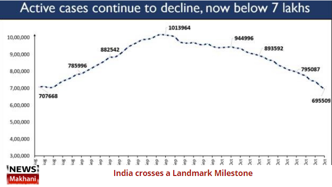 India has leaped across a significant milestone in its fight against COVID. The active caseload of the country has fallen below 7 lakh for the first time after two months (63 days). The active caseload was below the 7 lakh mark (6,97,330) last on 22nd August.