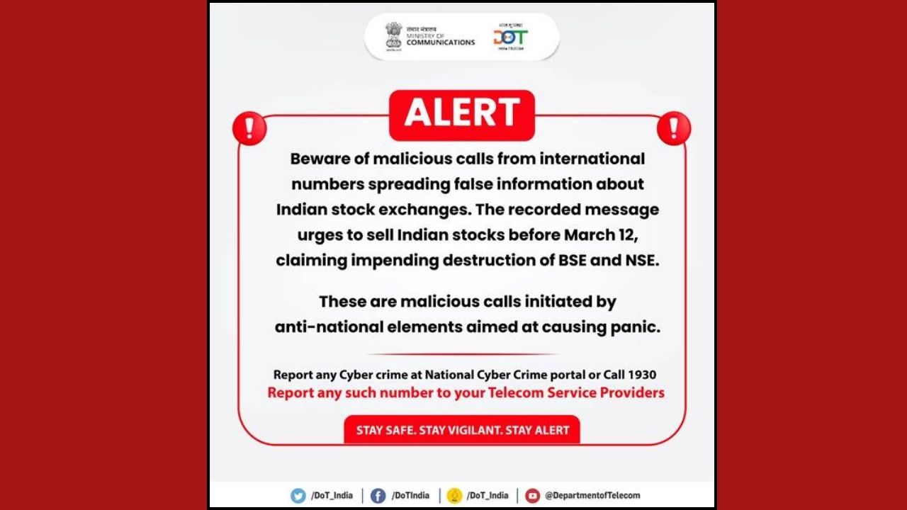 संचार मंत्रालय के दूरसंचार विभाग (डीओटी) ने नागरिकों को सलाह दी है कि वे अंतरराष्ट्रीय नंबरों से आने वाली दुष्टतापूर्ण कॉलों से सावधान रहें, जो भारत के स्टॉक एक्सचेंजों और व्यापार में गड़बड़ी पैदा करने के इरादे से की जाती हैं। इस तरह की दुष्टतापूर्ण कॉलें राष्ट्र-विरोधी तत्वों द्वारा की जाती हैं, जिनका उद्देश्य लोगों में भय पैदा करना है।