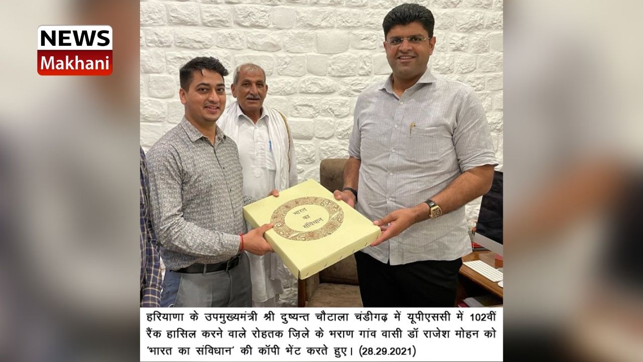 इस अवसर पर डिप्टी सीएम ने उन्हें बधाई देते हुए डॉ. राजेश के उज्ज्वल भविष्य की कामना की। श्री दुष्यंत चौटाला ने उन्हें ‘भारत का संविधान’ की कॉपी भेंट की। इस अवसर पर डॉ. राजेश मोहन के पिता श्री राजकंवर मोहन (अवर सचिव हरियाणा सिविल सचिवालय ) भी साथ थे।