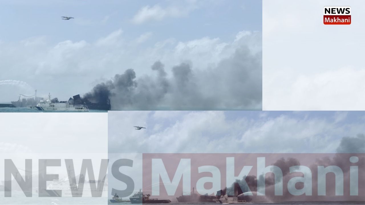 The persistent round-the-clock fire-fighting efforts of ICG ships in coordination with tugs deployed by Sri Lanka has prevented the fire from re-spreading towards vessel’s forward part thereby protecting anchor-chain cable arrangement from parting due to weakening from extreme heat. The fire presently appears to have considerably reduced as white fumes indicating lack of available combustible material are seen emanating from the mid region of the ship. However, flames are still visible in the aft section of the ship ahead of its superstructure.