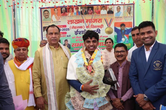 भाजपा प्रदेश अध्यक्ष पंडित मोहन लाल बड़ौली बुधवार को रोहतक के लाखन माजरा, सांघी पहुंचे। यहां उन्होंने गोल्ड मेडल लाने वाले ईशांत राठी, दीक्षा राठी और आदित्य हुड्डा सहित दीपक हुड्डा को भी सम्मानित किया। इस मौके पर श्री बड़ौली ने एशियन यूथ गेम्स में गोल्ड मेडल लाने वाले रिन्ढाणा के अखिल नरवाल को भी सम्मानित किया। श्री बड़ौली ने सभी खिलाड़ियों को बेहतरीन प्रदर्शन कर गोल्ड मेडल लाने की बधाई एवं शुभकामनाएं दी।