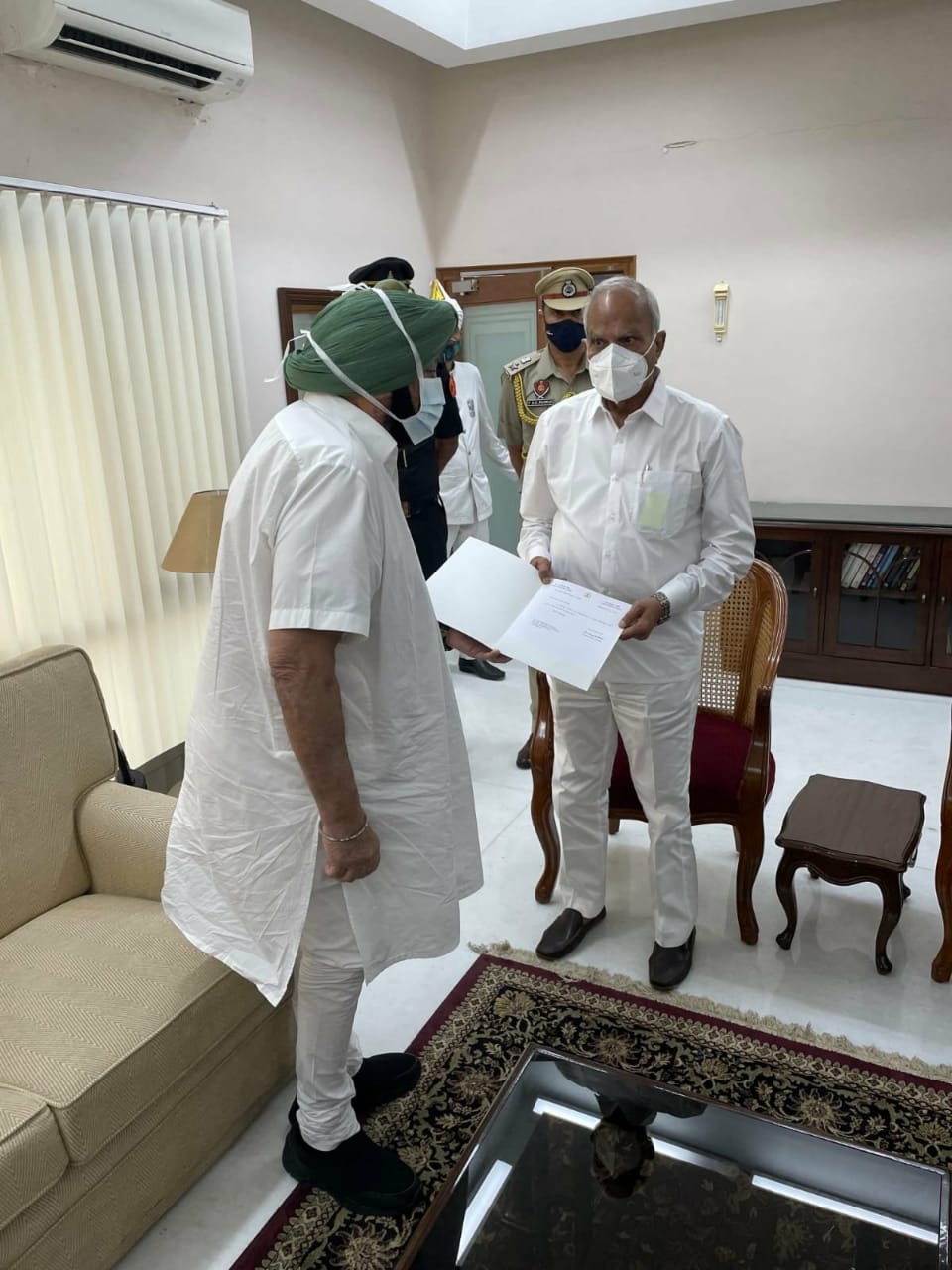 His wife Preneet Kaur, MP, accompanied him to the Governor house. His son Raninder Singh was also present, along with MPs Gurjeet Singh Aujla and Ravneet Singh Bittu, AG Atul Nanda and Chief Principal Secretary to CM Suresh Kumar.