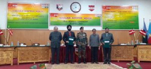 Leh, April 26: As part of the Indian Army’s initiative to secure a better future for Ladakhi youth, the Indian Army, under the aegis of Fire and Fury Corps, signed MoUs with corporate partner Hindustan Petroleum Corporation Limited (HPCL) and executing agency National Integrity and Educational Development Organisation, (NIEDO) today at HQ 14 Corps, Leh in the presence of Tashi Gyalson, Chief Executive Councillor, Leh; Jamyang Tsering Namgyal, MP, Ladakh; Advisor Ladakh, Umang Narula; Ravinder Kumar, Administrative Secretary, Lt Gen PGK Menon, AVSM, GOC 14 Corps along with Prince Singh, Chief Regional Manager, Retail J&K, HPCL, Dr Rohit Srivastav, Managing Trustee and CEO, NIEDO and various other senior Army officials and civil dignitaries.