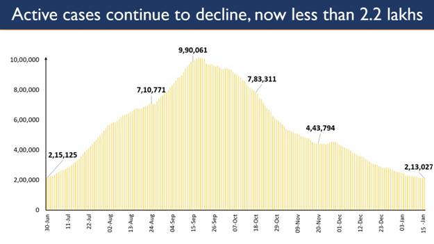 India’s total Active Caseload continues to have a sustained downward movement. It has dropped to 2.13 lakh (2,13,027). India’s present active caseload now consists of just 2.03% of India’s Total Positive Cases. The daily new cases added to the country’s COVID numbers have been below 20K in the recent days. The number of daily new cases in the last 24 hours is 15,590. 15,975 cases recovered and discharged in the last 24 hours. New cases per million population in India in the last seven days are 87. It is one of the lowest in the world. The number is significantly low when compared with countries like Russia, Germany, Brazil, France, Italy, USA and UK. The total recovered cases stand at 10,162,738. The gap between Recovered Cases and Active Cases, that is steadily increasing, has crossed 99 lakh and presently stands at 99,49,711. The difference in New Recoveries outnumbering New Cases has also improved the Recovery Rate to 96.52%. 81.15% of the new recovered cases are observed to be concentrated in 10 States/UTs. Kerala has reported the maximum number of single day recoveries with 4,337 newly recovered cases. 3,309 people recovered in Maharashtra in the past 24 hours followed by 970 in Chhattisgarh. 77.56% of the new cases are from 7 States and UTs. Kerala continues to report the highest daily new cases at 5,490. It is followed by Maharashtra with 3,579, while West Bengal reported 680 new cases. 191 case fatalities have been reported in the past 24 hours. Six States/UTs account for 73.30% of new deaths. Maharashtra saw the maximum casualties (70). Kerala and West Bengal follow with 19 and 17 daily deaths, respectively. Only 1 new deaths per million population was reported in India in the last seven days. With a Case Fatality Rate of 1.44%, deaths per million population in India are one of the lowest in the world.