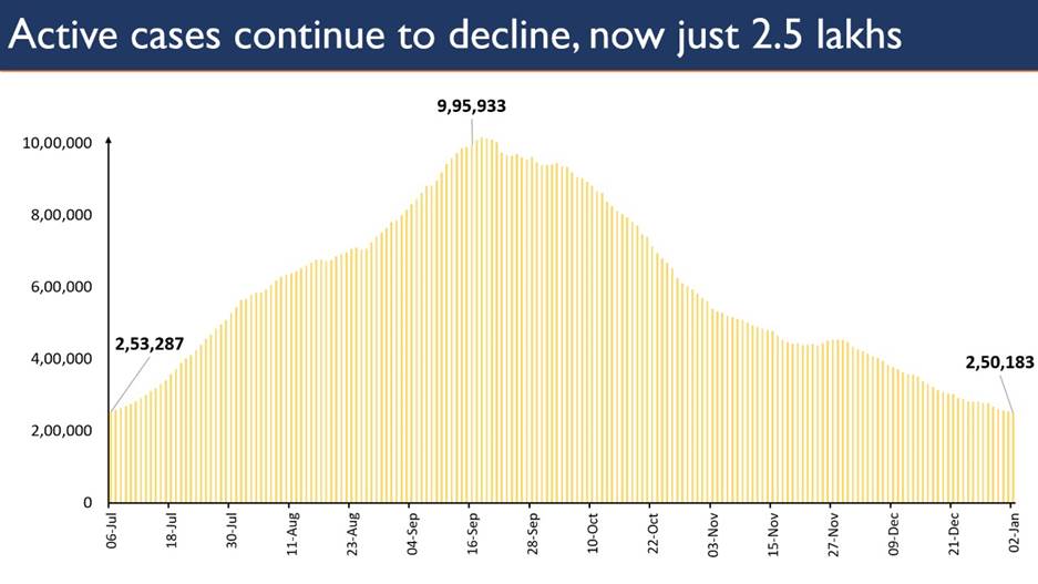 The trend of more daily recoveries than the daily cases has led to a contraction of active cases. India’s Active Caseload dropped down to 2.50 lakh which presently stands at 2,50,183. India’s active caseload comprises merely 2.43% of the total cases, now under 2.5%. While 19,079 persons in India were found to be COVID positive, 22,926 new recoveries were registered during the same period. This has led to a net decline of 4,071 cases from the total Active Caseload in the last 24 hours. Five States viz. Kerala, Maharashtra, Uttar Pradesh, West Bengal and Chhattisgarh contribute 62% of total active cases. India has recorded one of the lowest new cases per million population in the last 7 days (101). Brazil, Russia, France, Italy, USA and UK have much higher cases per million population reported in the last 7 days. India’s cumulative recoveries are inching closer to 1 crore. The cumulative recovered cases have surpassed  99 lakh (99,06,387). The Recovery Rate has improved to 96.12% today.  The gap between Recovered cases and Active cases is steadily increasing and presently stands at 96,56,204. 78.64% of the new recovered cases are contributed by ten States/UTs. Kerala leads with 5,111 persons recovering from COVID while Maharashtra recorded 4,279 recoveries. West Bengal registered another 1,496 daily recoveries. Ten States/UTs have contributed 80.56% of the new cases. Kerala reported 4,991 cases in the last 24 hours. Maharashtra registered another 3,524 new cases yesterday while West Bengal recorded 1,153 new cases. 224 case fatalities that have been reported in the past 24 hours. 75.45% of them are from Ten States/UTs. 26.33% of new fatalities reported are from Maharashtra which reported 59 deaths. West Bengal also saw a fatality count of 26 while Kerala reported 23 new deaths.