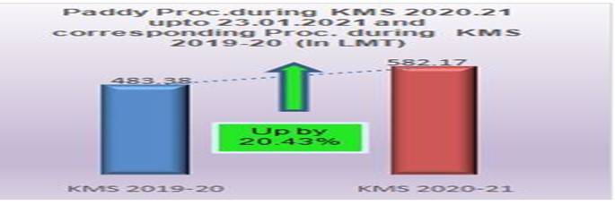 In the ongoing Kharif Marketing Season (KMS) 2020-21, Government continues to obtain Kharif 2020-21 crops at MSP from farmers as per existing MSP Schemes.Paddy procurement for Kharif 2020-21 is continuing smoothly in the procuring States & UTs of Punjab, Haryana, Uttar Pradesh, Telangana, Uttarakhand, Tamil Nadu, Chandigarh, Jammu & Kashmir, Kerala, Gujarat, Andhra Pradesh, Chhattisgarh, Odisha, Madhya Pradesh, Maharashtra, Bihar, Jharkhand, Assam, Karnataka and West Bengal with purchase of over 582.17 LMTs of paddy up to 23.01.2021.This is an increase of 20.43% against the last year corresponding purchase of 483.38LMT. Out of the total purchase of 582.17LMT, Punjab alone has contributed 202.77 LMT which is 34.83% of total procurement.About 83.83 Lac farmers have already been benefitted from the ongoing KMS procurement Operations with MSP value of Rs109915.15 Crore. Based on the proposal from the States, approval was accorded for procurement of 51.92 LMT of Pulse and Oilseeds of Kharif Marketing Season 2020 for the States of Tamil Nadu, Karnataka, Maharashtra, Telangana, Gujarat, Haryana, Uttar Pradesh, Odisha, Rajasthan and Andhra Pradesh under Price Support Scheme (PSS).The sanction for procurement of 1.23 LMT of Copra (the perennial crop) for the States of Andhra Pradesh, Karnataka, Tamil Nadu and Kerala was also given. Further, based on the concerned State Govt. proposals, the sanction for procurement of 2.50 LMT of Pulse and Oilseeds of Rabi Marketing Season 2020-2021 for the States of Gujarat and Tamil Nadu, was also given. For other States/UTs, approval will also be accorded on receipt of proposals for procurement of Pulses, Oilseeds and Copra under PSS so that procurement of FAQ grade of these crops can be made at notified MSP for the year 2020-21 directly from the registered farmers, if the market rate goes below MSP during the notified harvesting period in the respective States/UTs by the Central Nodal Agencies through State nominated procuring agencies. Upto 23.01.2021, the Government through its Nodal Agencies has procured 2,99,493.16 MT of Moong, Urad, Toor, Groundnut Pods and Soyabean having MSP value of Rs.1620.99 Crores benefitting 1,60,768 farmers in Tamil Nadu, Maharashtra, Gujarat, Haryana and Rajasthan. 5089 MT of copra (the perennial crop) having MSP value of Rs.52.40 crore has been procured benefitting 3961 farmers in Karnataka and Tamil Nadu upto 23.01.2021. At present, in respect of Copra and Urad, rates are ruling above MSP in most of the major producing States. The respective State/UTs Governments are making necessary arrangements for commencement of procurement from the date as decided by the respective States based on the arrivals of Pulses and Oilseeds.Procurement operations of seed cotton (Kapas) under MSP are going on smoothly in the States of Punjab, Haryana, Rajasthan, Madhya Pradesh, Maharashtra, Gujarat, Telangana, Andhra Pradesh, Odisha and Karnataka. Till 23.01.2021 a quantity of 8752758 cotton bales valuing Rs.25568.30 Crore has been procured benefitting 1801799 farmers.