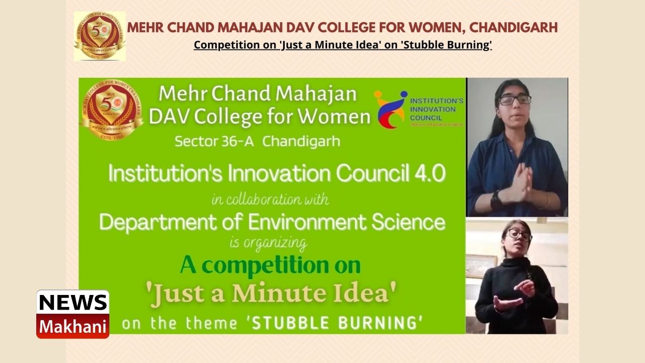 चंद महाजन डीएवी कॉलेज फॉर विमेन, चंडीगढ़ में इंस्टीट्यूशन इनोवेशन काउंसिल और डिपार्टमेंट ऑफ एनवायरमेंट साइंस ने ‘स्टबल बर्निंग’ विषय पर जस्ट ए मिनट आइडिया प्रतियोगिता का आयोजन किया। प्रतियोगिता में पराली जलाने के खतरे की ओर ध्यान आकर्षित करने और छात्रों को इससे निपटने के लिए नवीन विचार देने के लिए प्रेरित करने का प्रयास किया गया ।