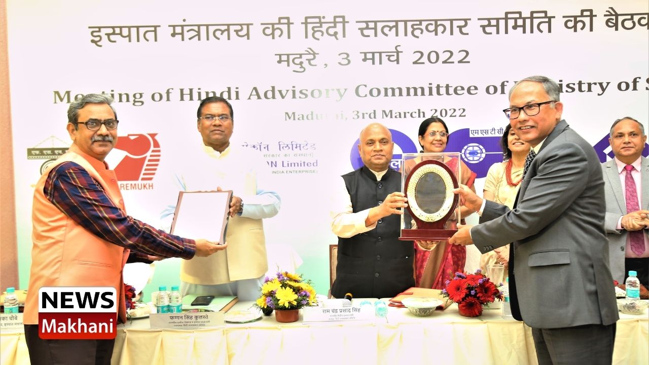 National Mineral Development Corporation Ltd. (NMDC), Country’s largest Iron Ore producer, a CPSE under Ministry of Steel received 1st prize in the Ispat Rajbhasha Award for 2018-19 and 2020-21 and the Ispat Rajbhasha Prerna Award for 2019-20 in the meeting of the Hindi Salahakar Committee of the Ministry of Steel held in Madurai on 3rd March 2022. The Union Minister of Steel, Shri Ram Chandra Prasad Singh, presented the accolades to Shri Sumit Deb, Chairman and Managing Director, NMDC. He appreciated the efforts of all the Steel PSEs in putting into practice the official language of India and congratulated NMDC for winning the awards.