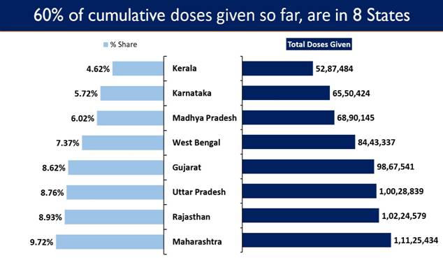 8 states account for 59.76% of the total doses given so far in the country. Over 33 lakh vaccination doses were administered in the last 24 hours. As on Day 89 of the vaccination drive (14th April, 2021), 33,13,848 vaccine doses were given. Out of which, 28,77,473 beneficiaries were vaccinated across 44,864 sessions for 1st dose and 4,36,375 beneficiaries received 2nd dose of vaccine.