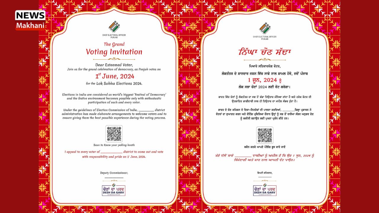 इस सम्बन्धी जानकारी देते हुये मुख्य निर्वाचन अधिकारी सिबिन सी ने बताया कि लोकतंत्र के सबसे बड़े त्योहार में वोटरों की अधिक से अधिक भागीदारी यकीनी बनाने के लिए सभी जिलों के डिप्टी कमिशनरों की तरफ से वोटरों को ‘चुनाव निमंत्रण’ दिया जायेगा, जिसमें वोटरों को 1 जून, 2024 को अपनी वोट के अधिकार का प्रयोग करने की अपील की गई है। यह कार्ड बीएलओज़ की तरफ से घर-घर दिए जाएंगे।