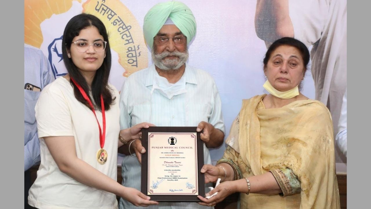 पंजाब मैडीकल काऊंसिल के प्रधान डॉ. ए.एस. सेखों द्वारा आज यहाँ यह सम्मान हासिल करने डी.एम.सी. लुधियाना से पास हुईं टॉपर डॉ. ध्रुविका तिवाड़ी को दिया गया।