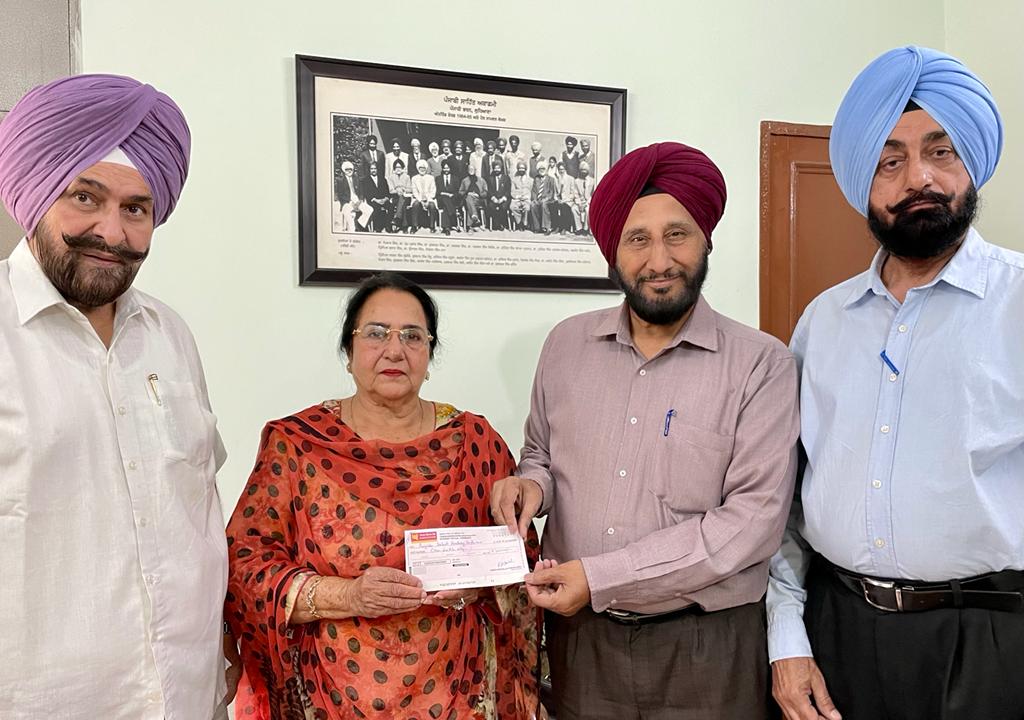 In the memory of her beloved friend Prof. Nirpjit Kaur Gill, Dr. Ramesh Inder Kaur Bal handed over a cheque of Rs 1 lakh to Punjabi Sahit Akademi president Dr. Lakhwinder Singh Johal and General Secretary Dr Guriqbal Singh in the presence of Prof Gurbhajan Singh Gill.