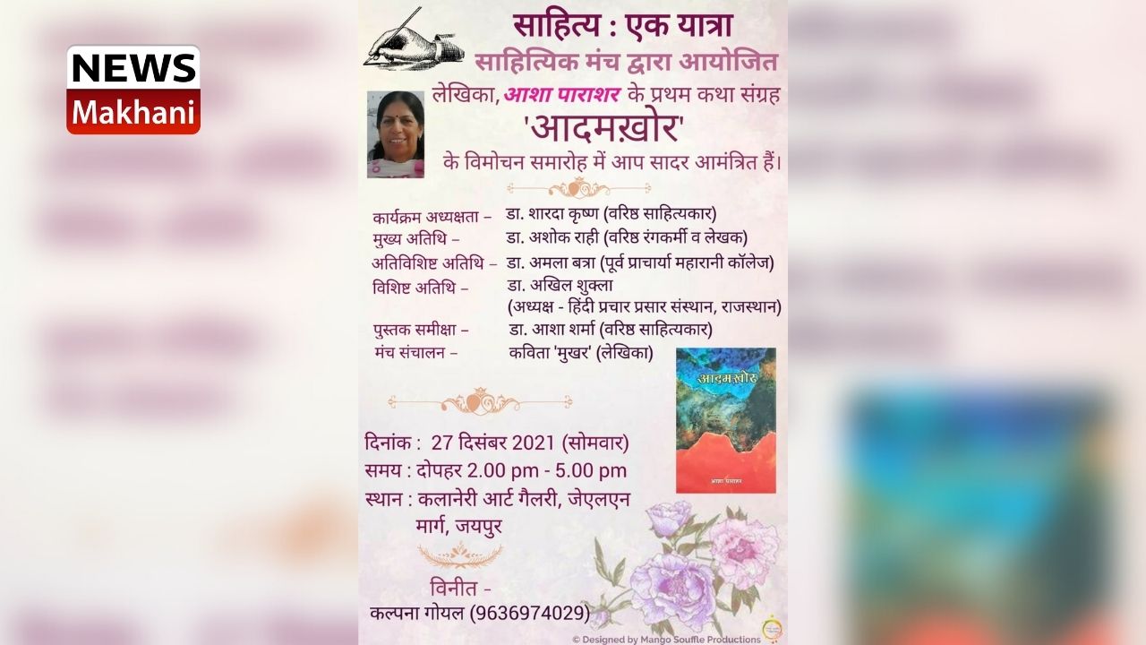 लेखिका आशा पाराशर के कथा संग्रह 'आदमखोर' का विमोचन 27 दिसम्बर को कलानेरी आर्ट गैलेरी में