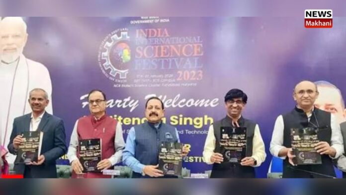 Union Minister of State for Science & Technology Dr. Jitendra Singh while releasing the brochure of the ninth edition of India International Science Festival (IISF) 2023 on 16 December 2023 during the Curtain raiser program organised at Constitutional Club, New Delhi. Principal Scientific Adviser Prof. Ajay Kumar Sood, Secretary DST Dr. Abhay Karandikar, Secretary DBT Dr. Rajesh S. Gokhale and Secretary MoES Dr. M. Ravichandran are accompanying to hon’ble Minister.