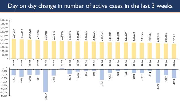 India’s active cases today stand at 1,92,308. The share of Active Cases in the total Positive Cases has further shrunk to 1.81%. Rising daily recoveries and declining new cases has ensured a total net reduction of the Active Caseload. A net decline of 4,893 cases has been recorded in the total active cases in last 24 hours. Following the national trend of consistent decline in the active cases, 17 States/UTs have cases per million population lower than the national average. India’s cases per million population stand at 7,689. 5 States viz. Kerala, Maharashtra, Uttar Pradesh, Karnataka and West Bengal account for 73% of the total active cases in the country. As on 21st January, 2021, till 7 AM, a total of 8,06,484 beneficiaries have received the vaccination. In the last 24 hours, 1,31,649 people were vaccinated across 2,398 sessions. 14,118 sessions has been conducted so far.