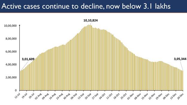 India’s trajectory of active cases continues to follow a steadily dipping path. The total Active Caseload has dropped to 3.05 lakh (3,05,344). This has been made possible by the trend of recoveries exceeding new cases and low number of fatalities per day which have ensured a total net reduction of the Active Caseload. India’s present active caseload consists of just 3.04% of India’s Total Positive Cases. The new recoveries of 29,690 in the last 24 hours have led to a net decline of 3,407 in the Total Active cases. 10 States/UTs account for 66% of the total active cases in the country. The number of daily new cases in the last 24 hours is  26,624. The daily new cases have been less than 40,000 since the last 21 days continuously. The total recovered cases are nearing 96 lakh (9,580,402). The difference in the New Recoveries outnumbering New Cases has also improved the Recovery Rate to 95.51%. 74.68% of the new recovered cases are observed to be concentrated in 10 States/UTs. Kerala has reported the maximum number of single day recoveries with 4,749 newly recovered cases. 3,119 people recovered in Maharashtra followed by 2,717 in West Bengal. 76.62% of the new cases are concentrated in 10 States and UTs. Kerala reported the highest daily new cases at 6,293. It is followed by Maharashtra with 3,940 new cases. 341 case fatalities have been reported in the past 24 hours. Ten States/UTs account for 81.23% of new deaths. Maharashtra saw the maximum casualties (74). West Bengal and Delhi follow with 43 and 32 daily deaths, respectively.