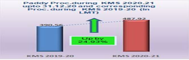 Kharif Marketing Season (KMS) 2020-21, Government continues to obtain Kharif 2020-21 crops at MSP from farmers as per existing MSP Schemes. Paddy procurement for Kharif 2020-21 is continuing smoothly in the procuring States & UTs of Punjab, Haryana, Uttar Pradesh, Telangana, Uttarakhand, Tamil Nadu, Chandigarh, Jammu & Kashmir, Kerala, Gujarat, Andhra Pradesh, Chattisgarh, Odisha, Madhya Pardesh, Maharashtra, Bihar, Jharkhand, Assam and West Bengal with purchase of over 487.92 LMT of paddy up to 31.12.2020. This is an increase of 24.93% against the last year corresponding purchase of 390.56 LMT. Out of the total purchase of 487.92 LMT, Punjab alone has contributed 202.77 LMT which is 41.55% of total procurement. About 62.28 Lac farmers have already been benefitted from the ongoing KMS procurement Operations with MSP value of Rs 92120.85 Crore. Based on the proposal from the States, approval was accorded for procurement of 51.66 LMT of Pulse and Oilseeds of Kharif Marketing Season 2020 for the States of Tamil Nadu, Karnataka, Maharashtra, Telangana, Gujarat, Haryana, Uttar Pradesh, Odisha, Rajasthan and Andhra Pradesh under Price Support Scheme(PSS). Further, sanction for procurement of 1.23 LMT of Copra (the perennial crop) for the States of Andhra Pradesh, Karnataka, Tamil Nadu and Kerala was also given. For other States/UTs, approval will also be accorded on receipt of proposals for procurement of Pulses, Oilseeds and Copra under PSS so that procurement of FAQ grade of these crops can be made at notified MSP for the year 2020-21 directly from the registered farmers, if the market rate goes below MSP during the notified harvesting period in the respective States/UTs by the Central Nodal Agencies through State nominated procuring agencies.