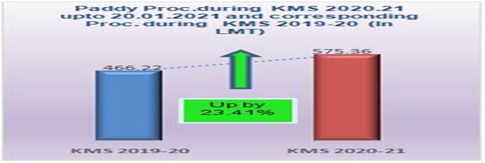 In Kharif Marketing Season (KMS) 2020-21, Government continues to obtain Kharif 2020-21 crops at MSP from farmers as per existing MSP Schemes. Paddy procurement for Kharif 2020-21 is working smoothly in the procuring States & UTs of Punjab, Haryana, Uttar Pradesh, Telangana, Uttarakhand, Tamil Nadu, Chandigarh, Jammu & Kashmir, Kerala, Gujarat, Andhra Pradesh, Chhattisgarh, Odisha, Madhya Pradesh, Maharashtra, Bihar, Jharkhand, Assam, Karnataka and West Bengal with purchase of over 575.36 LMTs of paddy up to 20.01.2021.This is an increase of 23.41 % against the last year corresponding purchase of 466.22 LMT. Out of the total purchase of 575.36 LMT, Punjab alone has contributed 202.77 LMT which is 35.24 % of total procurement. About 82.08 Lac farmers have already been benefitted from the ongoing KMS procurement Operations with MSP value of Rs. 108629.27 Crore. Based on the proposal from the States, approval was accorded for procurement of 51.66 LMT of Pulse and Oilseeds of Kharif Marketing Season 2020 for the States of Tamil Nadu, Karnataka, Maharashtra, Telangana, Gujarat, Haryana, Uttar Pradesh, Odisha, Rajasthan and Andhra Pradesh under Price Support Scheme (PSS). Further, sanction for procurement of 1.23 LMT of Copra (the perennial crop) for the States of Andhra Pradesh, Karnataka, Tamil Nadu and Kerala was also given. Also, sanction for procurement of 2.50 LMT of Pulse and Oilseeds of Rabi Marketing Season 2020-2021 for the States of Gujarat and Tamil Nadu, was given. For other States/UTs, approval will also be accorded on receipt of proposals for procurement of Pulses, Oilseeds and Copra under PSS so that procurement of FAQ grade of these crops can be made at notified MSP for the year 2020-21 directly from the registered farmers, if the market rate goes below MSP during the notified harvesting period in the respective States/UTs by the Central Nodal Agencies through State nominated procuring agencies. Upto 20.01.2021, the Government through its Nodal Agencies has obtained 298252.48 MT of Moong, Urad, Toor, Groundnut Pods and Soyabean having MSP value of Rs.1620.04 Crores benefitting 159951 farmers in Tamil Nadu, Maharashtra, Gujarat, Haryana and Rajasthan.