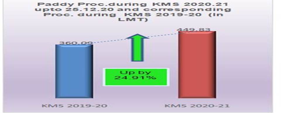 In the Kharif Marketing Season (KMS) 2020-21, Government continues to obtain Kharif 2020-21 crops at its MSP from farmers as per its existing MSP Schemes. Paddy procurement for Kharif 2020-21 is continuing smoothly in the procuring States & UTs of Punjab, Haryana, Uttar Pradesh, Telangana, Uttarakhand, Tamil Nadu, Chandigarh, Jammu & Kashmir, Kerala, Gujarat, Andhra Pradesh, Chattisgarh, Odisha, Madhya Pardesh, Maharashtra, Bihar, Jharkhand and West Bengal with purchase of over 449.83 LMTs of paddy up to 25.12.2020 against the last year corresponding purchase of 360.09 LMT showing an increase of 24.91 % over last year. Out of the total purchase of 449.83 LMT, Punjab alone has contributed 202.77 LMT which is 45.07% of total procurement. About 55.49 Lac farmers have already been benefitted from the ongoing KMS procurement Operations with MSP value of Rs84928.10 Crore. Based on the proposal from the States, approval was accorded for procurement of 51.66 LMT of Pulse and Oilseeds of Kharif Marketing Season 2020 for the States of Tamil Nadu, Karnataka, Maharashtra, Telangana, Gujarat, Haryana, Uttar Pradesh, Odisha, Rajasthan and Andhra Pradesh under Price Support Scheme (PSS). Further, sanction for procurement of 1.23 LMT of Copra (the perennial crop) for the States of Andhra Pradesh, Karnataka, Tamil Nadu and Kerala was also provided. For other States/UTs, approval will also be accorded on receipt of proposals for procurement of Pulses, Oilseeds and Copra under PSS so that procurement of FAQ grade of these crops can be made at notified MSP for the year 2020-21 directly from the registered farmers, if the market rate goes below MSP during the notified harvesting period in the respective States/UTs by the Central Nodal Agencies through State nominated procuring agencies. Till 25.12.2020, the Government through its Nodal Agencies has procured 226758.57 MT of Moong, Urad, Groundnut Pods and Soybean having MSP value of Rs. 1214.09Crores benefitting 123292 farmers in Tamil Nadu, Maharashtra, Gujarat, Haryana and Rajasthan. 5089 MT of copra (the perennial crop) having MSP value of Rs.52.40 Crore has been procured benefitting 3961 farmers in Karnataka and Tamil Nadu upto25.12.2020 as against the last year corresponding purchase of 293.34 MT of copra. In respect of Copra and Urad, rates are ruling above MSP in most of the major producing States. The respective State/UTs Governments are making necessary arrangements for commencement of procurement from the date as decided by the respective States based on the arrivals in respect of Kharif Pulses and Oilseeds. Procurement operations of seed cotton (Kapas) under MSP are going on smoothly in the States of Punjab, Haryana, Rajasthan, Madhya Pradesh, Maharashtra, Gujarat, Telangana, Andhra Pradesh, Odisha and Karnataka. Till 25.12.2020 a quantity of 6730298 cotton bales valuing Rs.19697.98 Crore has been procured benefitting 1310539 farmers.