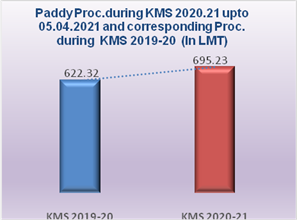 Paddy procurement in the ongoing season Kharif 2020-21 is continuing smoothly in the procuring States with purchase of over 695.23 LMTs of paddy (upto05.04.2021)against the last year corresponding purchase of 622.32 LMT. About 102.98 Lakh farmers have already been benefitted from the ongoing KMS procurement Operations with MSP value of Rs. 1,31,247.46 Crore.