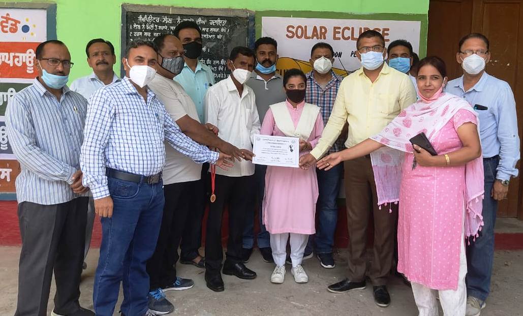 ਪਠਾਨਕੋਟ, 21 ਜੂਨ 2021 ਸਮਰ ਕੈਂਪ ਦੌਰਾਨ ਸਿੱਖਿਆ ਵਿਭਾਗ ਵੱਲੋਂ ਪੂਰੇ ਪੰਜਾਬ ਵਿੱਚ ਕਰਵਾਏ ਗਏ ਕੰਪਿਊਟਰ ਸਾਇੰਸ ਦੇ ਇ- ਸਬਦ ਮੁਕਾਬਲਿਆਂ ਵਿੱਚ ਜਿਲ੍ਹਾ ਪਠਾਨਕੋਟ ਦੇ ਸਰਕਾਰੀ ਸੀਨੀਅਰ ਸੈਕੰਡਰੀ ਸਕੂਲ ਘਰੋਟਾ ਦੀ ਬਾਰਵੀਂ ਜਮਾਤ ਦੀ ਵਿਦਿਆਰਥਣ ਕਿ੍ਰਤਿਕਾ ਸਲਾਰੀਆ ਨੇ ਸਟੇਟ ਵਿੱਚੋਂ ਪਹਿਲਾ ਸਥਾਨ ਪ੍ਰਾਪਤ ਕਰਕੇ ਸਕੂਲ ਅਤੇ ਜਿਲ੍ਹੇ ਦਾ ਨਾਮ ਰੌਸਨ ਕੀਤਾ ਸੀ। ਕਿ੍ਰਤਿਕਾ ਸਲਾਰੀਆ ਦੀ ਇਸ ਪ੍ਰਾਪਤੀ ਲਈ ਸਕੂਲ ਸਟਾਫ ਵੱਲੋਂ ਪਿ੍ਰੰਸੀਪਲ ਪੰਕਜ ਮਹਾਜਨ ਦੀ ਅਗਵਾਈ ਹੇਠ ਇੱਕ ਸਾਦਾ ਸਮਰੋਹ ਦਾ ਆਯੋਜਨ ਕਰਕੇ ਕਿ੍ਰਤਿਕਾ ਸਲਾਰੀਆ ਨੂੰ ਸਰਟੀਫਿਕੇਟ ਅਤੇ ਤਗਮਾ ਦੇ ਕੇ ਸਨਮਾਨਿਤ ਕੀਤਾ। ਸਮਰੋਹ ਵਿੱਚ ਕੰਪਿਊਟਰ ਸਾਇੰਸ ਦੇ ਡੀਐਮ ਵਿਕਾਸ ਰਾਏ, ਜਿਲ੍ਹਾ ਕੋਆਰਡੀਨੇਟਰ ਮੀਡੀਆ ਸੈਲ ਬਲਕਾਰ ਅੱਤਰੀ, ਬੀਐਮ ਸੁਭਾਸ ਚੰਦਰ, ਬੀਐਮ ਸੁਖਦੇਵ ਸਿੰਘ, ਪਿੰਡ ਘਰੋਟਾ ਦੇ ਸਾਬਕਾ ਸਰਪੰਚ ਨਰੇਸ ਕੁਮਾਰ, ਪੰਚ ਦੇਵਦੱਤ, ਐਸਐਮਸੀ ਚੇਅਰਮੈਨ ਨਿਸਾ ਦੇਵੀ ਮੁੱਖ ਤੌਰ ਤੇ ਸਾਮਲ ਹੋਏ।