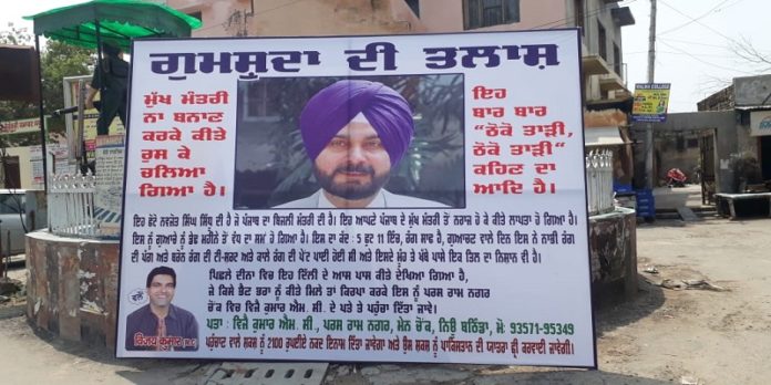 ਸਿੱਧੂ ਦੇ ਲੱਗੇ ਪੋਸਟਰ ‘ਤੇ ਲਿਖਿਆ ਹੈ, ”ਮੁੱਖ ਮੰਤਰੀ ਨਾ ਬਣਾਉਣ ਕਰਕੇ ਸਿੱਧੂ ਕਿਤੇ ਰੁਸ ਕੇ ਚਲਾ ਗਿਆ ਹੈ। ਇਸ ਦੇ ਨਾਲ ਹੀ ਇਹ ਵੀ ਲਿਖਿਆ ਹੈ ਕਿ ਇਹ ਵਾਰ-ਵਾਰ ਠੋਕੋ ਤਾੜੀ-ਠੋਕੋ ਤਾੜੀ ਕਹਿਣ ਦੇ ਆਦੀ ਹੈ।”