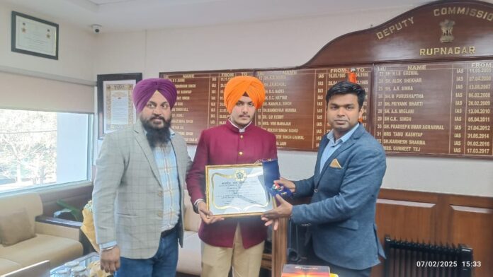 ਡਿਪਟੀ ਕਮਿਸ਼ਨਰ ਰੂਪਨਗਰ ਸ੍ਰੀ ਹਿਮਾਂਸ਼ੂ ਜੈਨ ਨੇ ਰੂਪਨਗਰ ਜ਼ਿਲ੍ਹੇ ਦੇ ਜਤਿਨਪ੍ਰੀਤ ਸਿੰਘ ਨੂੰ ਇੰਡੀਅਨ ਕੌਂਸਲ ਫੋਰ ਚਾਇਲਡ ਵੈਲਫੇਅਰ (ਆਈਸੀਸੀ ਡਬਲਿਊ) ਵਲੋਂ 100 ਦੇ ਕਰੀਬ ਲੋਕਾਂ ਦੀ ਜਾਨ ਬਚਾਉਣ ਸਦਕਾ ਬਹਾਦਰੀ ਪੁਰਸਕਾਰ ਪ੍ਰਾਪਤ ਕਰਨ ਉੱਤੇ ਆਪਣੇ ਦਫਤਰ ਵਿਖੇ ਸਨਮਾਨਿਤ ਕੀਤਾ।