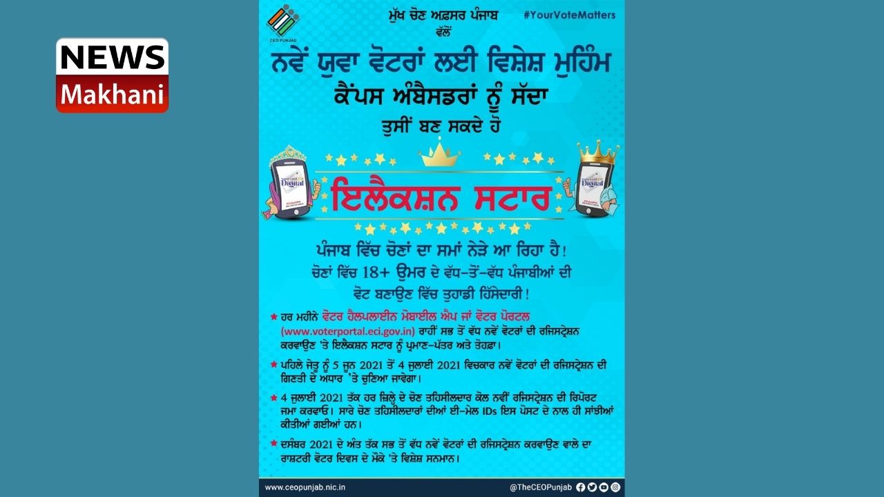 ਜ਼ਿਕਰਯੋਗ ਹੈ ਕਿ ਪੰਜਾਬ ਵਿੱਚ ਚੋਣਾਂ ਦਾ ਸਮਾਂ ਨੇੜੇ ਆ ਰਿਹਾ ਹੈ।ਚੋਣਾਂ ਵਿੱਚ 18 ਸਾਲ ਜਾਂ ਵੱਧ ਉਮਰ ਦੇ ਵੱਧ ਤੋਂ ਵੱਧ ਵੋਟ ਬਣਾਉਣ ਲਈ ਨਵੇਂ ਵੋਟਰਾਂ ਦੀ ਰਜਿਸਟ੍ਰੇਸ਼ਨ ਦੀ ਗਿਣਤੀ ਦੇ ਅਧਾਰ ਤੇ ਕਾਲਜਾਂ ਦੇ ਚੋਣ ਸਾਖ਼ਰਤਾ ਕਲੱਬਾਂ ਦੇ ਮੈਂਬਰਾਂ ਨੂੰ ਵੀ ਇਲੈਕਸ਼ਨ ਸਟਾਰ ਬਣਨ ਦਾ ਮੌਕਾ ਦਿੱਤਾ ਗਿਆ ਹੈ ।
