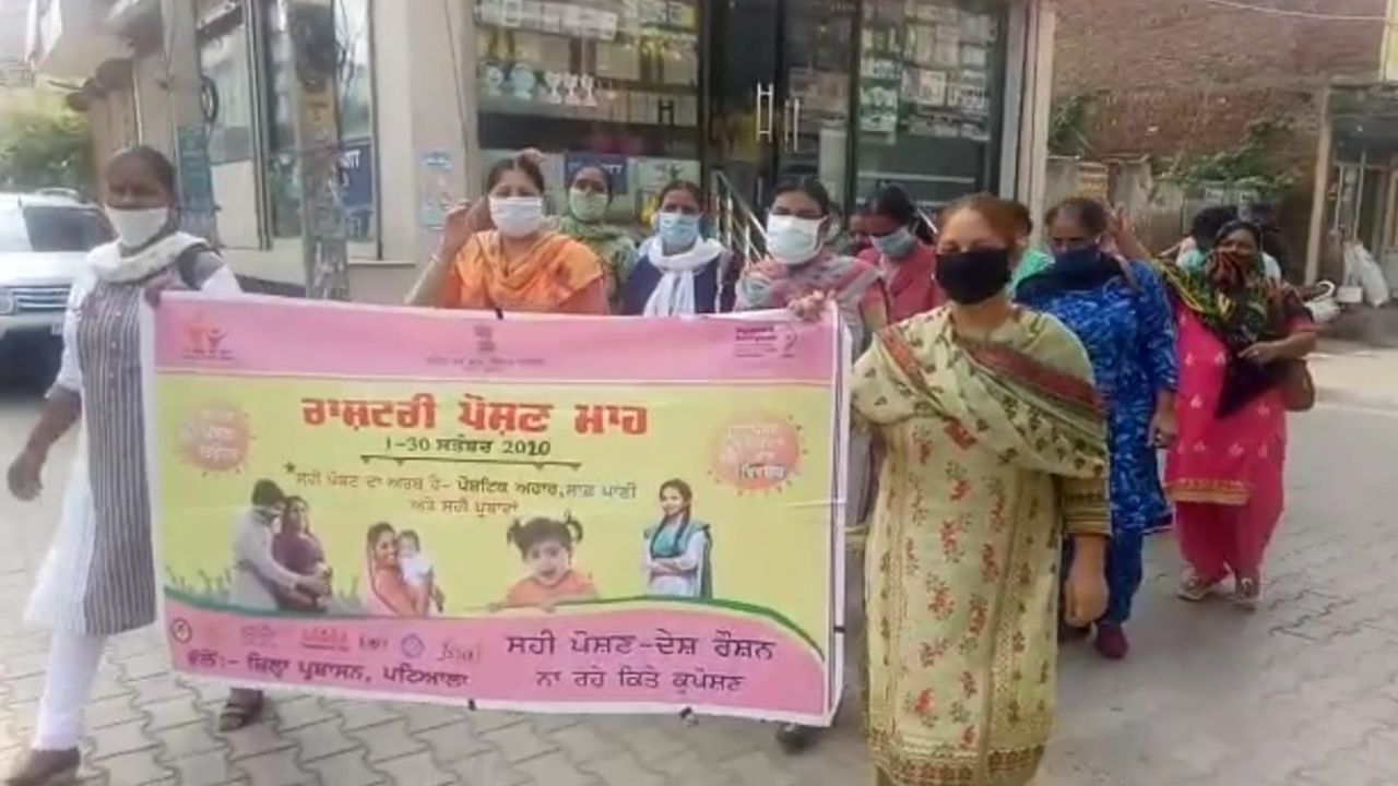 ਭਾਰਤ ਸਰਕਾਰ ਵੱਲੋਂ 1 ਤੋਂ 30 ਸਤੰਬਰ ਤੱਕ ਐਲਾਨੇ ਪੋਸ਼ਣ ਮਾਹ ਦੌਰਾਨ ਪਟਿਆਲਾ ਜ਼ਿਲ੍ਹੇ ‘ਚ ਡਿਪਟੀ ਕਮਿਸ਼ਨਰ ਸ੍ਰੀ ਕੁਮਾਰ ਅਮਿਤ ਦੇ ਦਿਸ਼ਾ-ਨਿਰਦੇਸ਼ਾਂ ਤਹਿਤ ਜ਼ਿਲ੍ਹਾ ਪ੍ਰੋਗਰਾਮ ਅਫ਼ਸਰ ਵੱਲੋਂ ਵੱਖ-ਵੱਖ ਗਤੀਵਿਧੀਆਂ ਕਰਵਾਈਆਂ ਜਾ ਰਹੀਆਂ ਹਨ, ਜਿਸ ਤਹਿਤ ਅੱਜ ਆਂਗਣਵਾੜੀ ਵਰਕਰਾਂ ਵੱਲੋਂ ਜਾਗਰੂਕਤਾ ਰੈਲੀ ਕੱਢਕੇ ਲੋਕਾਂ ਨੂੰ ਪੌਸ਼ਟਿਕ ਖਾਣਾ ਖਾਣ ਲਈ ਪ੍ਰੇਰਿਤ ਕੀਤਾ ਗਿਆ ਅਤੇ ਆਂਗਣਵਾੜੀ ਸੈਂਟਰਾਂ ‘ਚ ਪੋਸ਼ਣ ਵਾਟਿਕਾ ਬਣਾਕੇ ਉਥੇ ਸਬਜ਼ੀਆਂ ਬੀਜੀਆਂ ਗਈਆਂ।