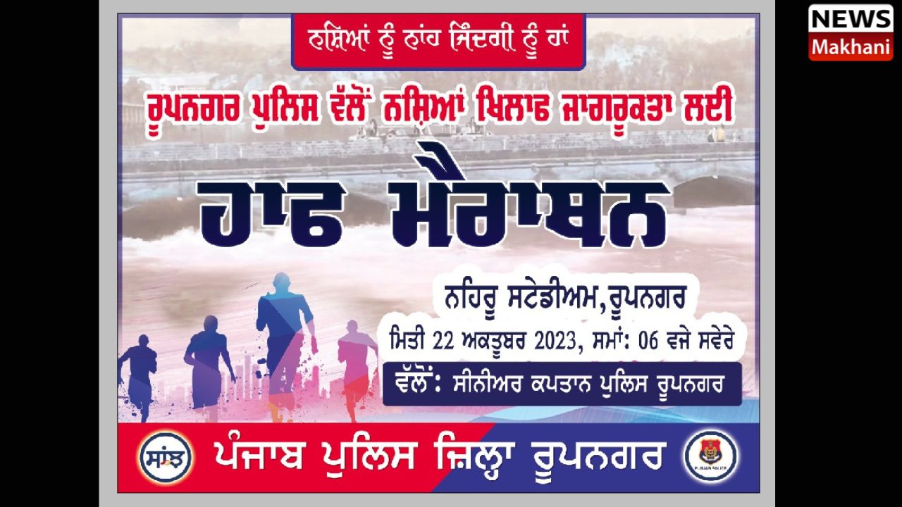 ਮੁੱਖ ਮੰਤਰੀ ਪੰਜਾਬ ਸ. ਭਗਵੰਤ ਸਿੰਘ ਮਾਨ ਅਤੇ ਡੀ.ਜੀ.ਪੀ ਪੰਜਾਬ ਗੌਰਵ ਯਾਦਵ ਦੀਆਂ ਹਦਾਇਤਾਂ ਉਤੇ ਸੂਬੇ ਵਿਚ ਨਸ਼ਿਆਂ ਖਿਲਾਫ ਮੁਹਿੰਮ ਚਲਾਈ ਜਾ ਰਹੀ ਹੈ ਜਿਸ ਦੇ ਮੱਦੇਨਜ਼ਰ ਰੂਪਨਗਰ ਪੁਲਿਸ ਵਲੋਂ 22 ਅਕਤੂਬਰ ਨੂੰ ਸਵੇਰੇ 6.00 ਵਜੇ ਨਹਿਰੂ ਸਟੇਡੀਅਮ ਰੂਪਨਗਰ ਵਿਖੇ ਨਸ਼ਿਆਂ ਖਿਲਾਫ ਜਾਗਰੂਕਤਾ ਹਾਫ ਮੈਰਾਥਨ ਦਾ ਆਯੋਜਨ ਕੀਤਾ ਜਾ ਰਿਹਾ ਹੈ।