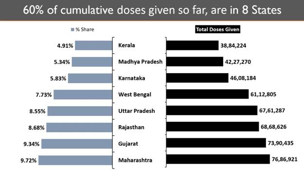 8 States account for 60% of the cumulative vaccine doses given so far. India’s daily new cases continue to rise. Over 1 Lakh (1,03,558) new cases were registered in the last 24 hours. Eight States including Maharashtra, Chhattisgarh, Karnataka, Uttar Pradesh, Delhi, Tamil Nadu, Madhya Pradesh and Punjab have shown a steep rise in the COVID daily new cases. 81.90% of the new cases are reported from these 8 states.