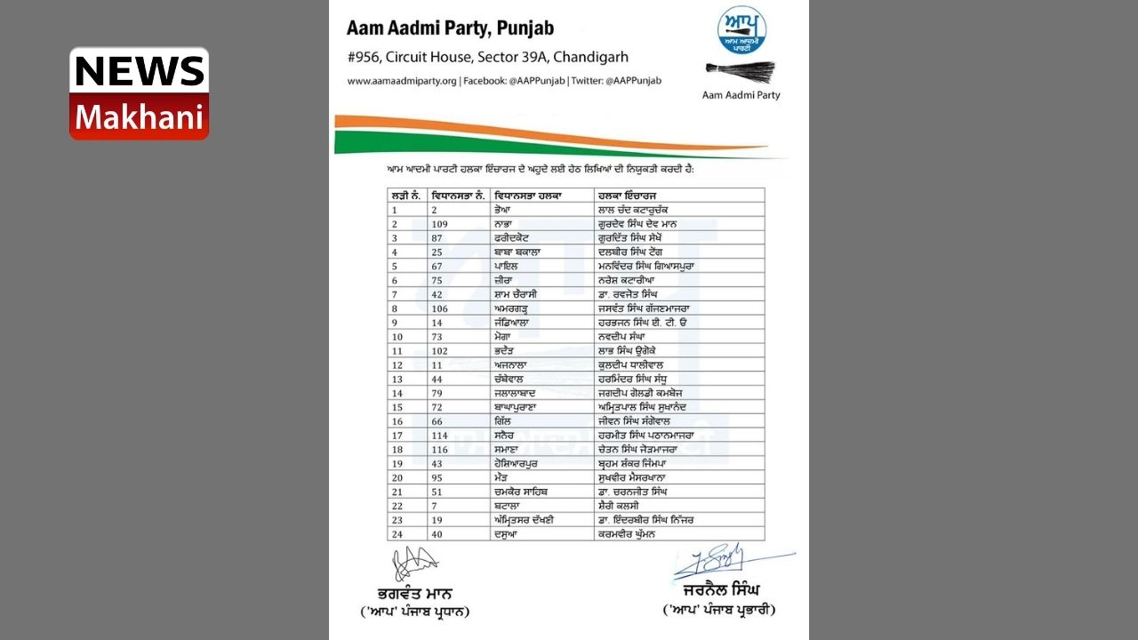 ਆਪ ਆਗੂਆਂ ਵੱਲੋਂ ਜਾਰੀ ਸੂਚੀ ਅਨੁਸਾਰ ਵਿਧਾਨ ਸਭਾ ਹਲਕਾ ਭੋਆ ਲਈ ਲਾਲ ਚੰਦ ਕਟਾਰੂਚੱਕ ਨੂੰ ਹਲਕਾ ਇੰਚਾਰਜ ਨਿਯੁਕਤ ਕੀਤਾ ਗਿਆ ਹੈ, ਜਦੋਂ ਕਿ ਵਿਧਾਨ ਸਭਾ ਹਲਕਾ ਨਾਭਾ ਲਈ ਗੁਰਦੇਵ ਸਿੰਘ ਦੇਵ ਮਾਨ, ਹਲਕਾ ਫਰੀਦਕੋਟ ਲਈ ਗਰਦਿੱਤ ਸਿੰਘ ਸੇਖੋਂ, ਹਲਕਾ ਬਾਬਾ ਬਕਾਲਾ ਲਈ ਦਲਬੀਰ ਸਿੰਘ ਟੋਂਗ, ਹਲਕਾ ਪਾਇਲ ਲਈ ਮਨਵਿੰਦਰ ਸਿੰਘ ਗਿਆਸਪੁਰਾ, ਹਲਕਾ ਜੀਰਾ ਲਈ ਨਰੇਸ ਕਟਾਰੀਆ, ਹਲਕਾ ਸਾਮ ਚੁਰਾਸੀ ਲਈ ਡਾ. ਰਵਜੋਤ ਸਿੰਘ, ਹਲਕਾ ਅਮਰਗੜ੍ਹ ਲਈ ਜਸਵੰਤ ਸਿੰਘ ਗੱਜਣ ਮਾਜਰਾ, ਹਲਕਾ ਜੰਡਿਆਲਾ ਲਈ ਹਰਭਜਨ ਸਿੰਘ ਈ.ਟੀ.ਓ, ਹਲਕਾ ਮੋਗਾ ਲਈ ਨਵਦੀਪ ਸੰਘਾ, ਹਲਕਾ ਭਦੌੜ ਲਈ ਲਾਭ ਸਿੰਘ ਉਗੋਕੇ, ਹਲਕਾ ਅਜਨਾਲਾ ਲਈ ਕੁਲਦੀਪ ਧਾਲੀਵਾਲ, ਹਲਕਾ ਚੱਬੇਵਾਲ ਲਈ ਹਰਮਿੰਦਰ ਸਿੰਘ ਸੰਧੂ, ਹਲਕਾ ਜਲਾਲਾਬਾਦ ਲਈ ਜਗਦੀਪ ਗੋਲਡੀ ਕੰਬੋਜ, ਹਲਕਾ ਬਾਘਾ ਪੁਰਾਣਾ ਲਈ ਅੰਮ੍ਰਿਤਪਾਲ ਸਿੰਘ ਸੁਖਾਨੰਦ, ਹਲਕਾ ਗਿੱਲ ਲਈ ਜੀਵਨ ਸਿੰਘ ਸੰਗੋਵਾਲ, ਹਲਕਾ ਸਨੌਰ ਲਈ ਹਰਮੀਤ ਸਿੰਘ ਪਠਾਣ ਮਾਜਰਾ, ਹਲਕਾ ਸਮਾਣਾ ਲਈ ਚੇਤਨ ਸਿੰਘ ਜੋੜਮਾਜਰਾ, ਹਲਕਾ ਹਸਅਿਾਰਪੁਰ ਲਈ ਬ੍ਰਹਮ ਸੰਕਰ ਜਿੰਮਪਾ, ਹਲਕਾ ਮੌੜ ਲਈ ਸੁਖਵੀਰ ਮੈਸਰਖਾਨਾ, ਹਲਕਾ ਚਮਕੌਰ ਸਾਹਿਬ ਲਈ ਡਾ. ਚਰਨਜੀਤ ਸਿੰਘ, ਹਲਕਾ ਬਟਾਲਾ ਲਈ ਸੈਰੀ ਕਲਸੀ, ਹਲਕਾ ਅੰਮ੍ਰਿਤਸਰ ਦੱਖਣੀ ਲਈ ਡਾ. ਇੰਦਰਬੀਰ ਸਿੰਘ ਨਿੱਜਰ ਅਤੇ ਹਲਕਾ ਦਸੂਆ ਲਈ ਕਰਮਵੀਰ ਘੁੰਮਨ ਨੂੰ ਹਲਕਾ ਇੰਚਾਰਜ ਨਿਯੁਕਤ ਕੀਤਾ ਗਿਆ ਹੈ।